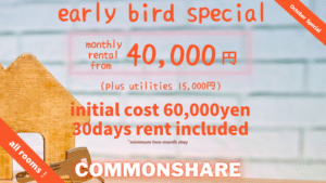 Thats right! You can stay in any of our properties, no contract fee, no hidden fees, just 60,000yen for the first 30 days!