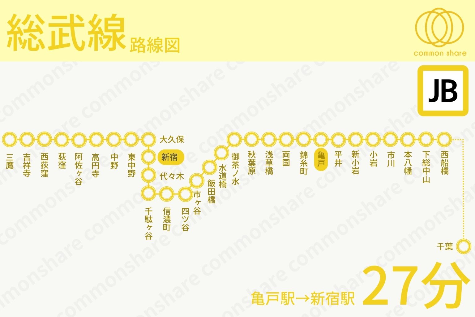 JR総武線沿い『亀戸』徒歩6分の駅近にシェアハウスがオープンしました!新宿までのアクセスも乗り換えなし、錦糸町も電車で3分、秋葉原まで7分と大変好立地な物件です。駅からほぼ商店街沿いの大通り1本で行けるため、夜道も明るく女性には安心です。